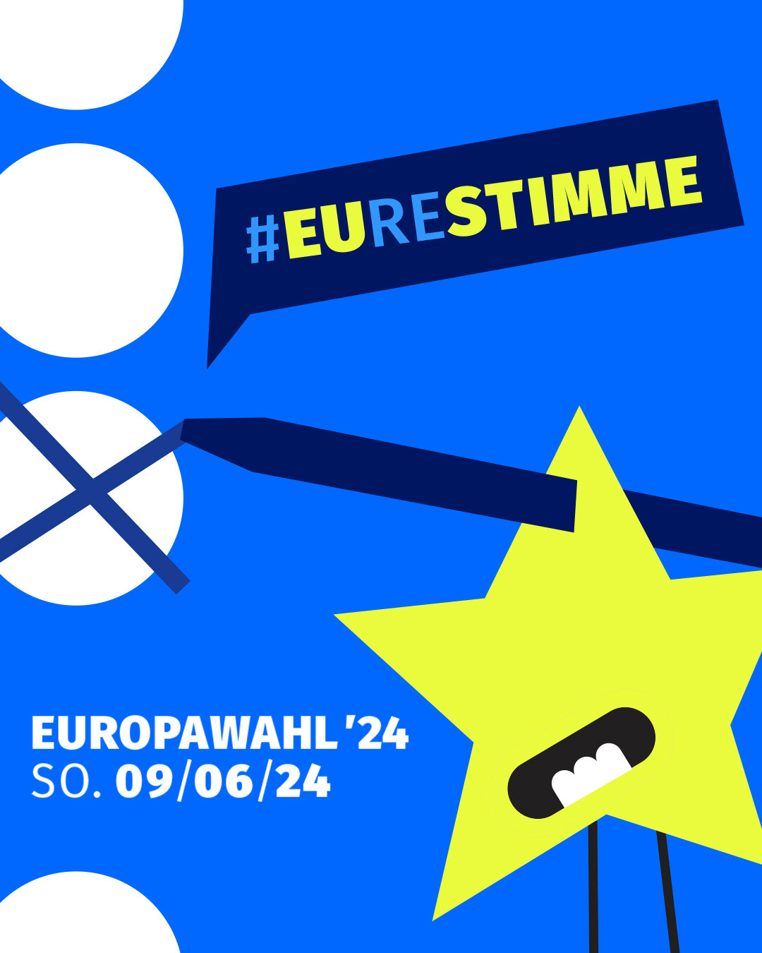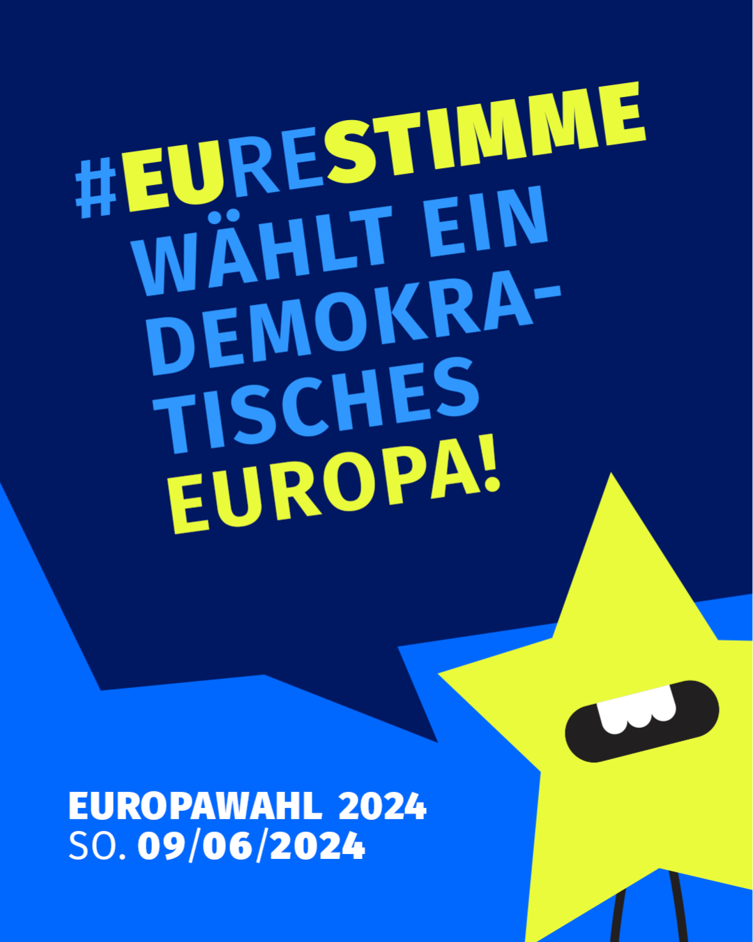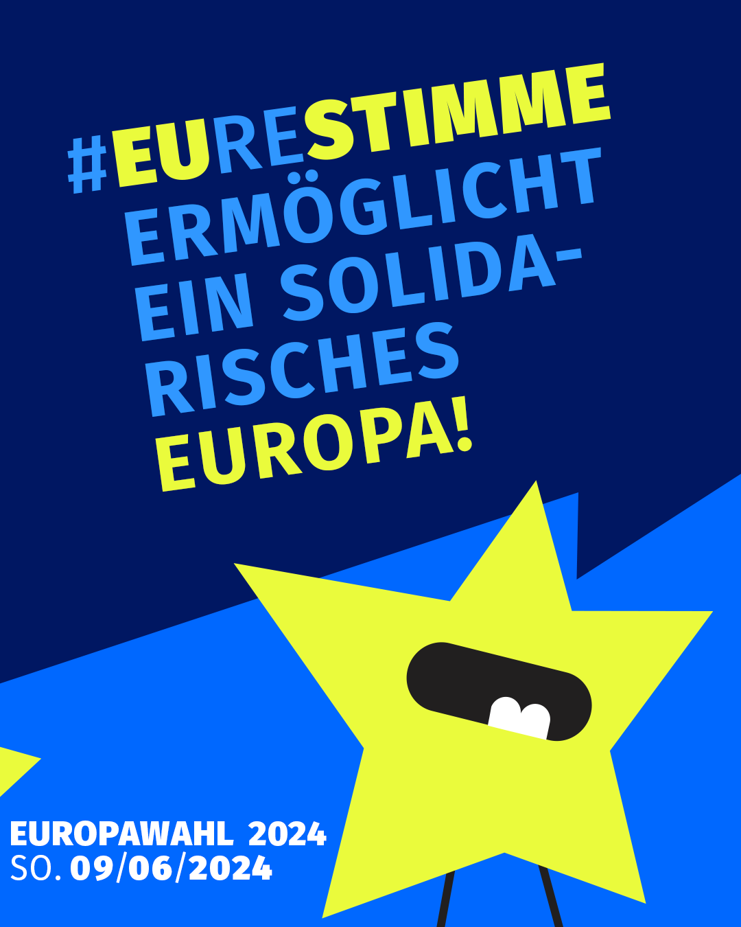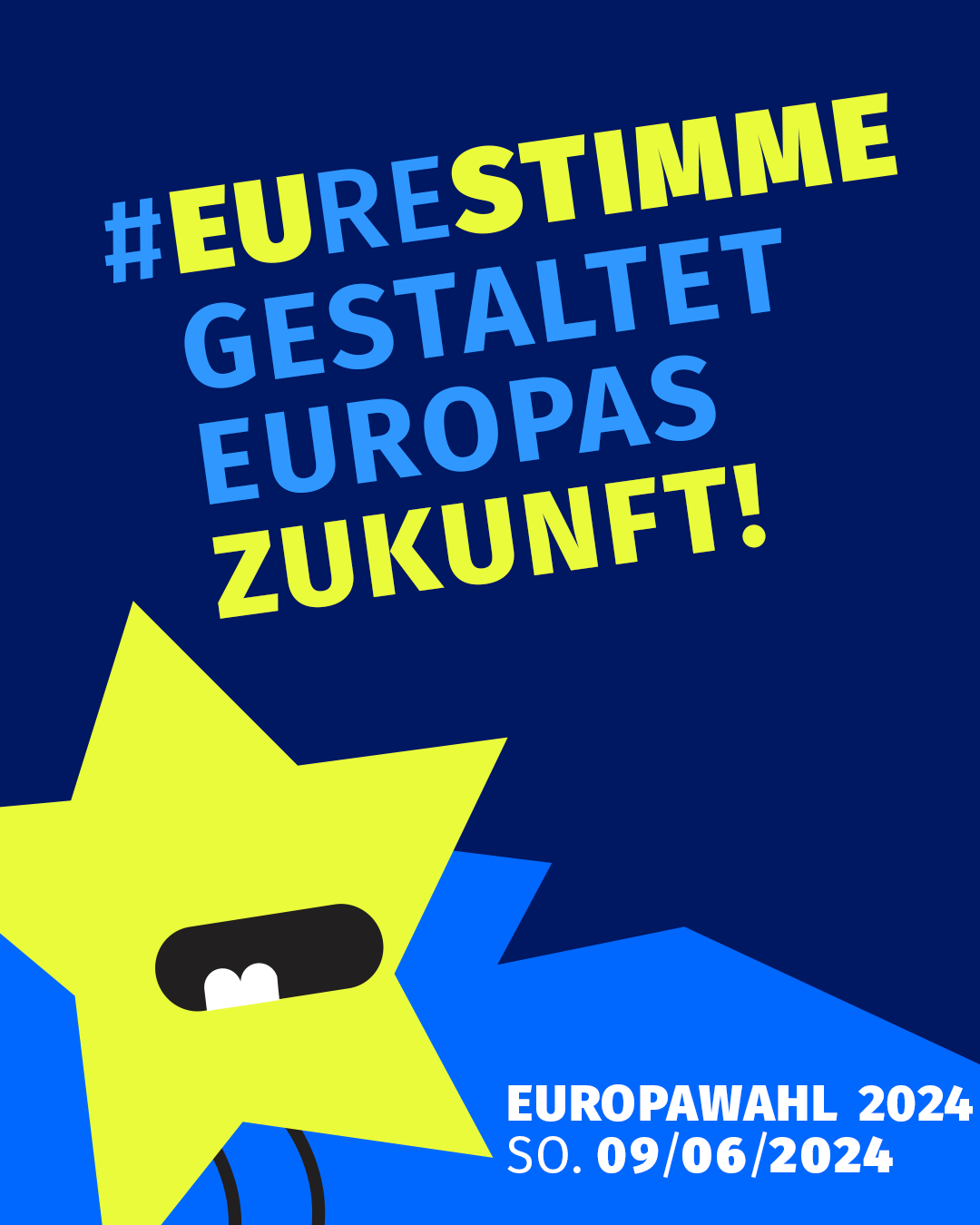 Die Kampagne des Bundesjugendrings nahm diese Errungenschaft auf und zeigt worauf es ankommt: auf Euch. Eure Stimme stärkt, schafft, gestaltet, ermöglicht und wählt Europa. Auf den Kampagnenelementen rufen die von individuellen Sterne ihre Botschaft. Sie machen Spaß, sind auf das Wesentliche reduziert und setzen das Wortspiel grafisch um. Es geht um euch und die EU! Ihr seid individuelle Charaktere und EUre Stimme formt die EU 🇪🇺
