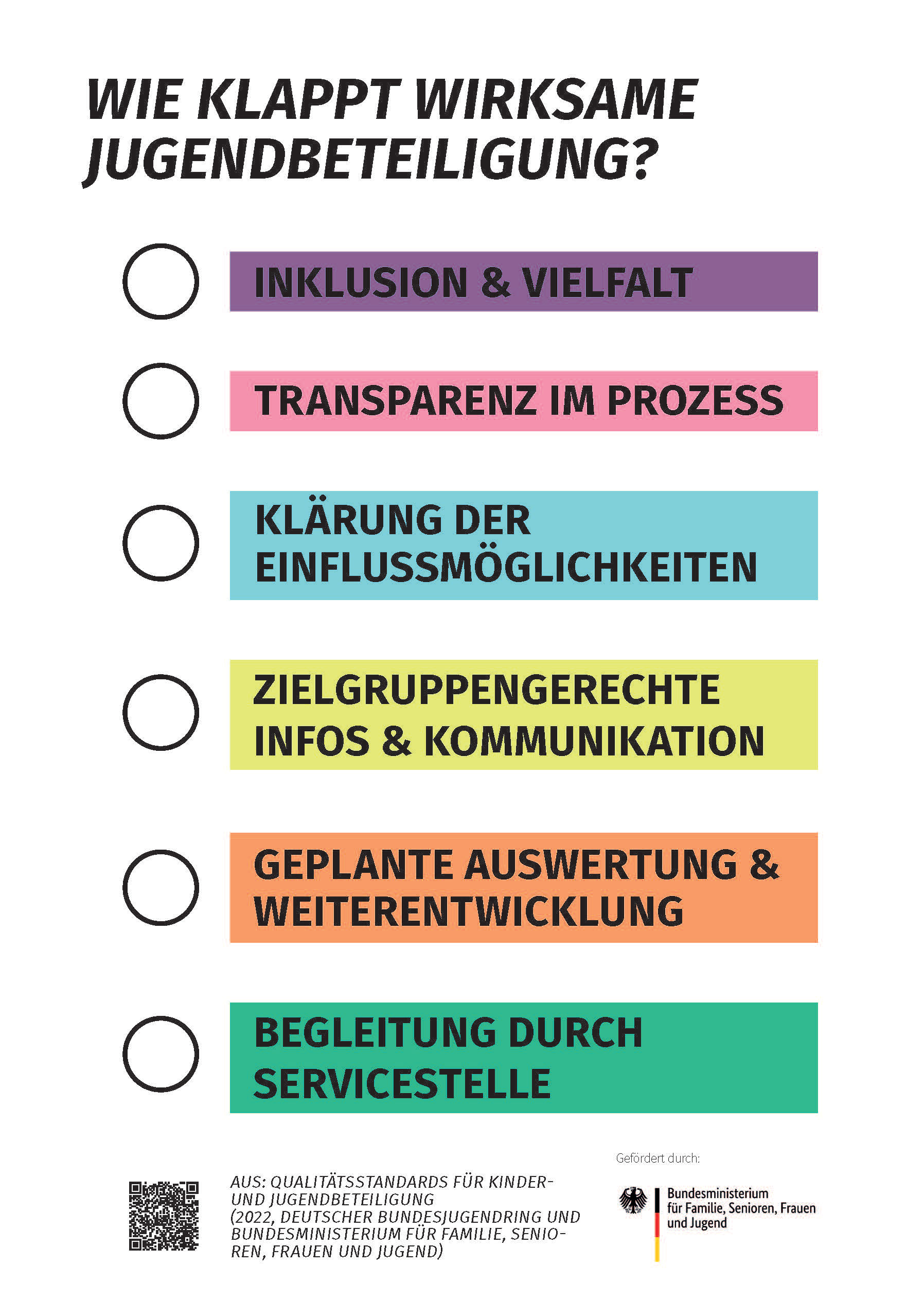 Neben der visuellen Identität, die Elemente des Bundesjugendrings verwendet, jung und professionell wirkt entwickelte ich einer Checkliste, in der die hohen Ansprüche an Jugendbeteiligung kommuniziert werden. Sie lädt ein Jugendbeteiligung systematisch zu denken und die eigenen Beteiligungsformate zu reflektieren.